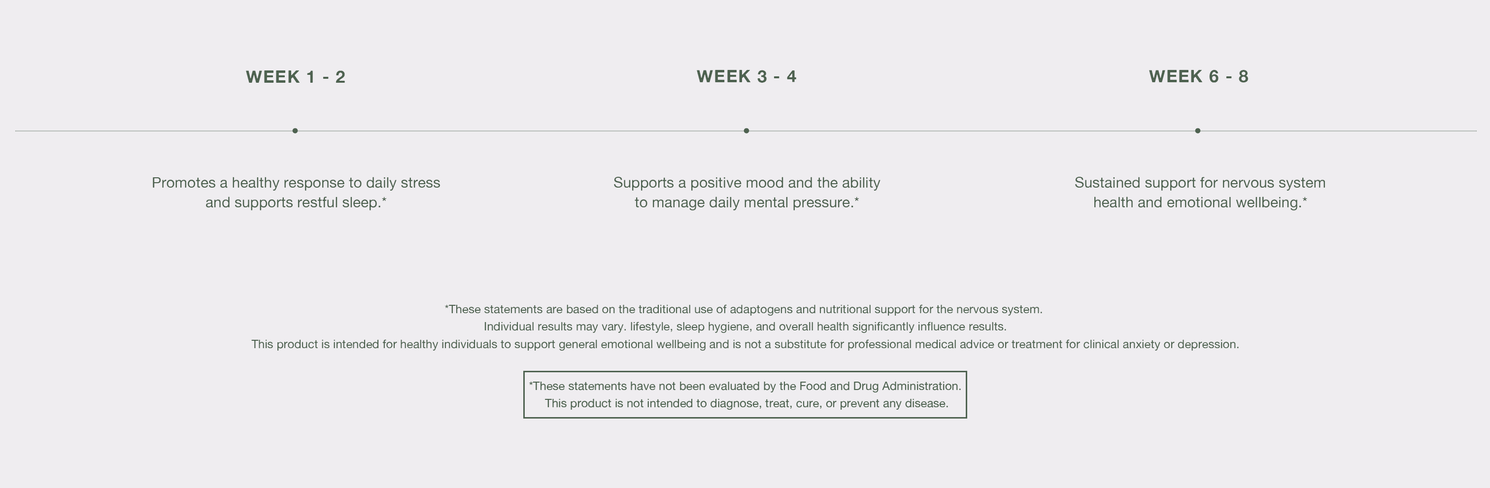 Weeks 6–8 Deeper, more integrated nervous system support. Daily stress may feel more manageable. Recovery from demanding days, hormonal shifts, and high-pressure periods may feel more efficient. Sleep quality may continue to improve with consistent use.*